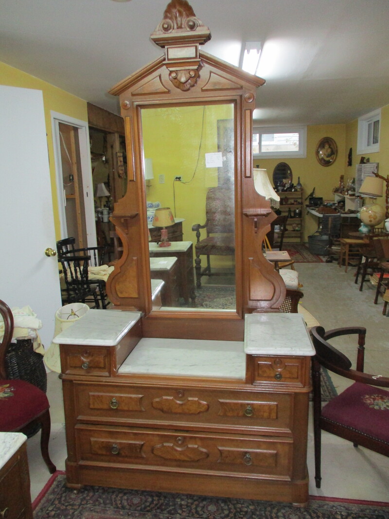 Bureau avec miroir en noyer de style Victorien avec dessus en marbre. Vers 1870. 2 petits tiroirs et 2 grand tiroirs. 42 X 20 X 85 po de hauteur