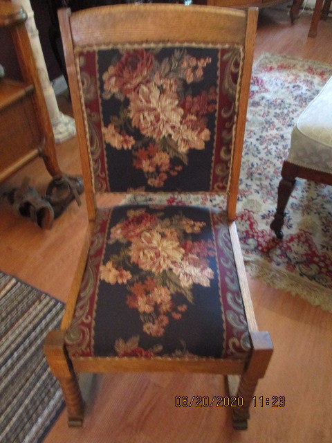 Petite bercante en chêne. Vers 1910. 2 pattes tournées à l'avant , le rembourrage et le recouvrement refait. Tissus a base de bleu marine et bourgogne. 18" X 28"X 33 h