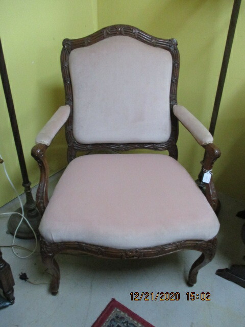 Fauteuil de style Louis XV avec sculptures, tant au dossier, qu'aux bras et au piètement. Vers 1900. Tissus vieux rose. En bonne condition. 28" X 29" X 39"H