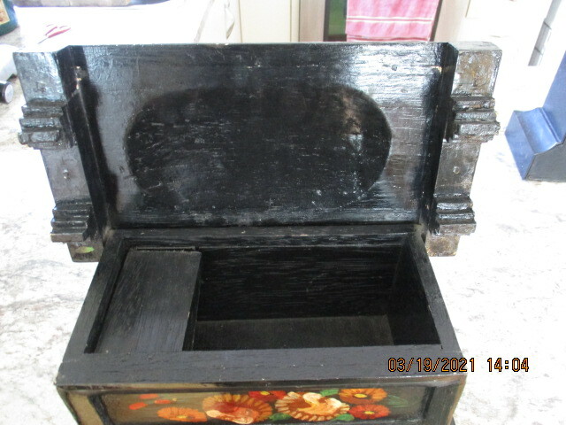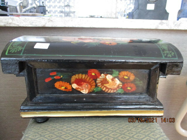 Joli coffre a documents en bois avec petit compartiment intérieur. Noir a bordure or avec fleurs multicolores peintes a la main. 13" de longueur 7" de largeur et 7" de hauteur