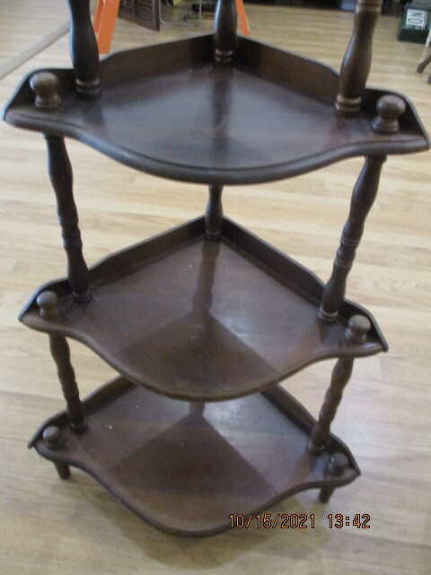 Étagère de coin foncée à 5 tablettes. En bon état. 24" de large par 17" de profondeur et 53" de hauteur