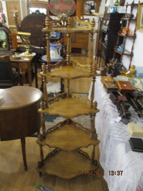 Étagère de coin pâle a 5 tablettes. En bon état. 25" de large par 18" de profondeur et 58" de hauteur