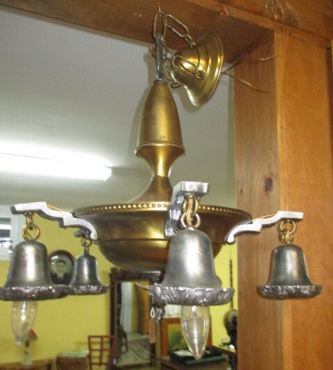 Plafonnier 5 branches en brasse et 5 branches en mtal argenté. 18" de diamètre