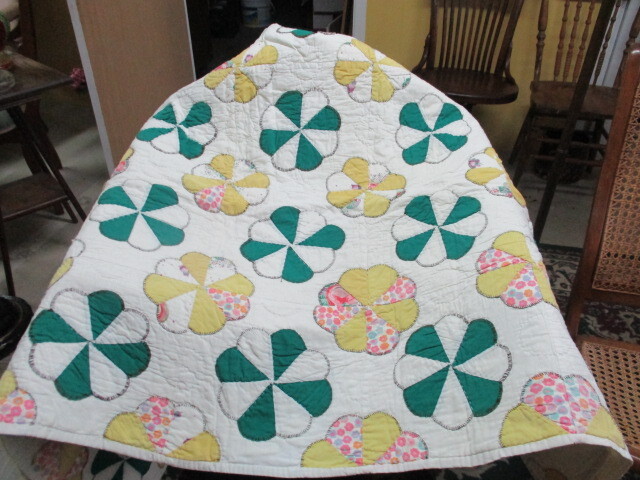 Courte pointe ancienne piquée à la main de 67" x 72" avec motifs "Soleil" dans les teintes de vert, jaune, et rose. Un petite erraflure à un endroit