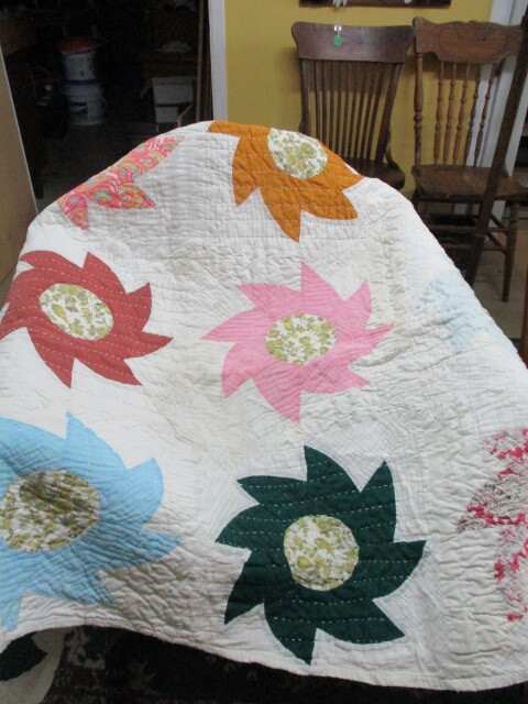Courte pointe ancienne piquée à la main de 56" x 69" avec motifs de roues de scie de différentes couleurs , en très bon état