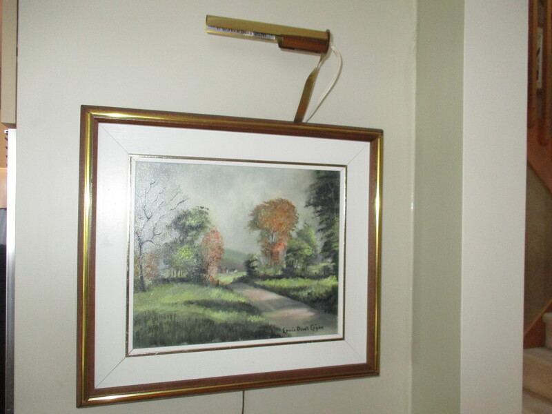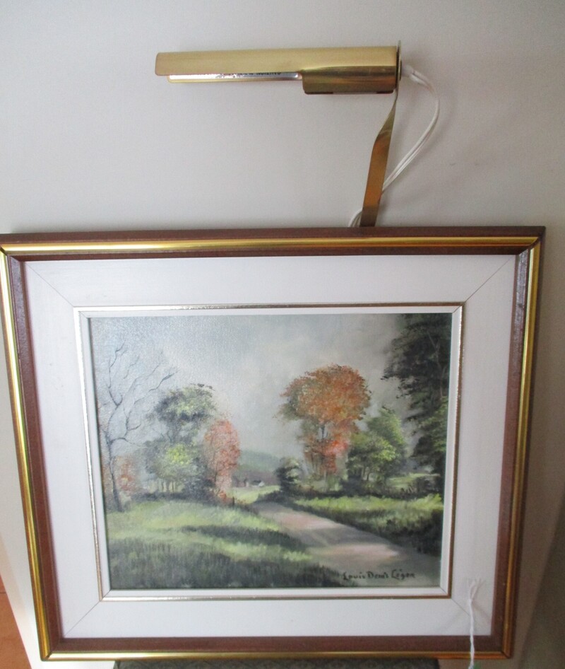 Toile du peintre Louis-Denis Léger de St-Jean-Port-Joli intitulé L'automne de 1986. 14po1/2 X 16po1/2. Lampe d"éclairage au dessus