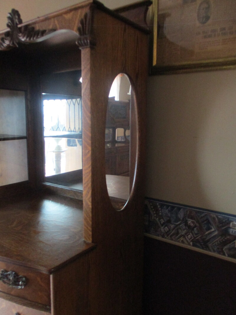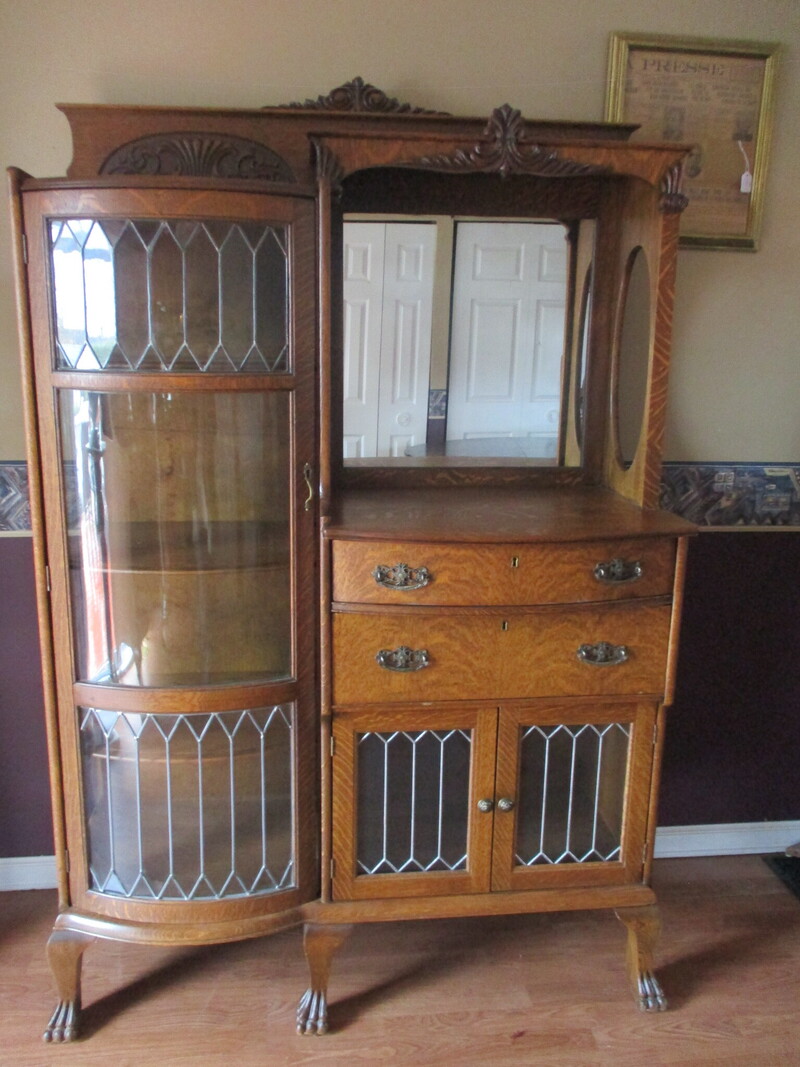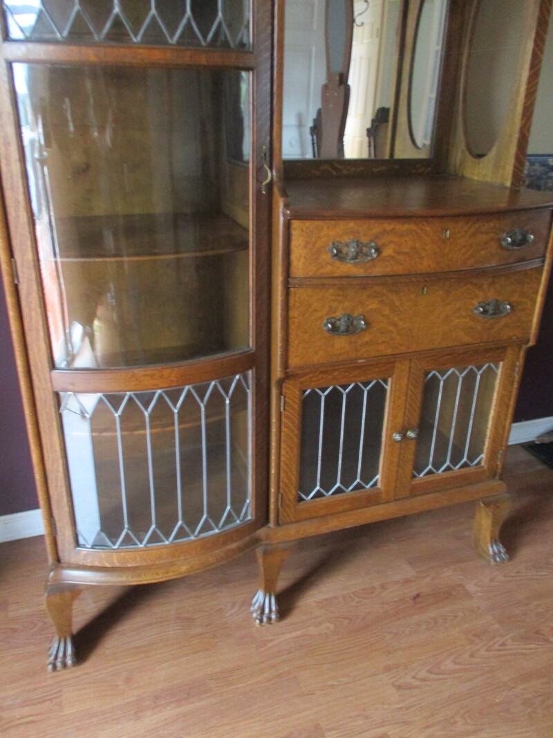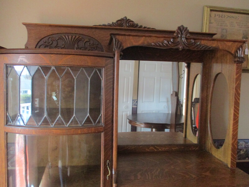Magnifique Side Bord en chêne maillé, vers 1900. 2 tiroirs dont un bombé, 2 portes a vitres dans le plomb. Grande portes a vitres bombées dont 2 vires dans le plomb, 2 pattes de lion et sculptures en haut du meuble. Excellente condition 47 X 20 X 74 PO de hauteur