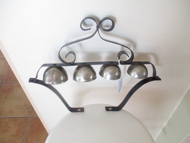 Cloches de sleigh de chevaux. 4 cloches a 3 greoots dans une armature en fer forgé 15 X 11X de hauteur
