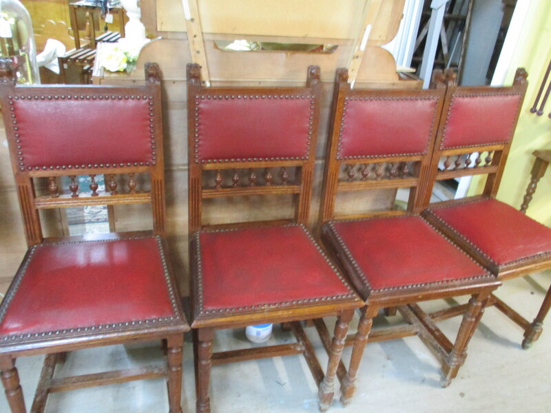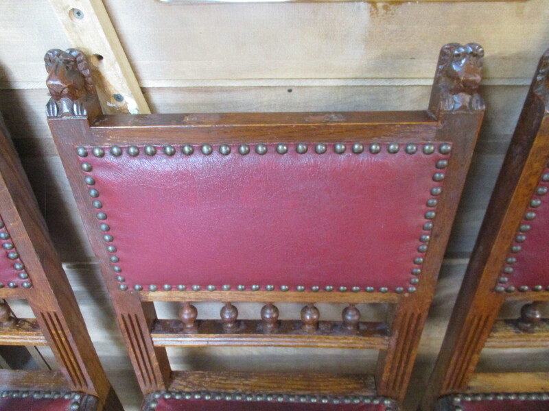 4 chaises médiévales en bois et cuir aux sièges et dossiers, 2 sculptures de têtes de lion a chaque dossier. 2 chaises supplémentaires mais qui doivent etre réparées