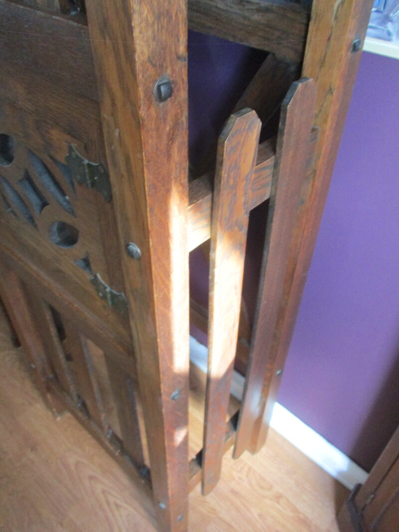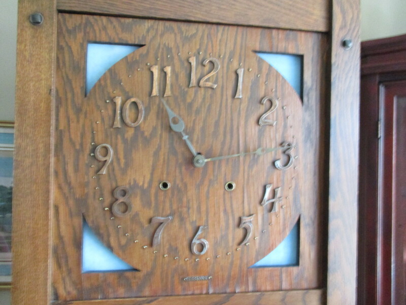 Horloge grand-père en chêne de style Mission. Vers 1900. Signé Sessions. Mécanisme avec 2 poids. On la remonte èa la semaine. Fonctionne très bien. 181/2 po X 121/2 X 71 po de hauteur