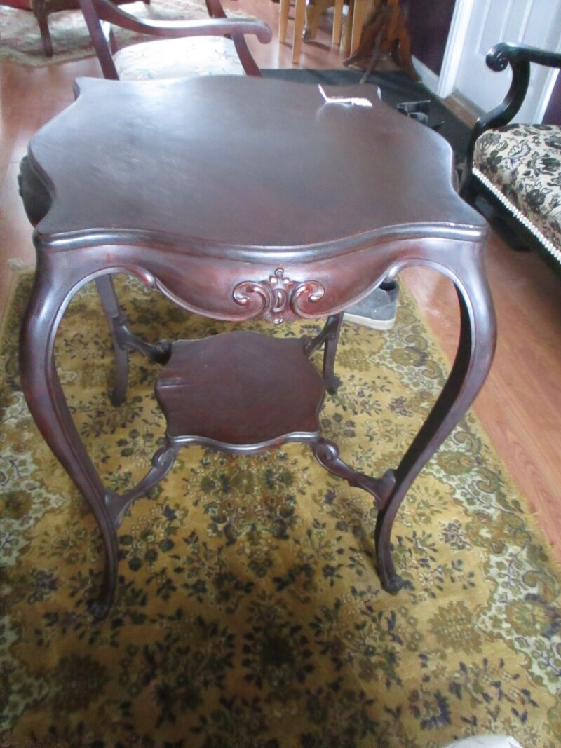 Table de salon Victorienne en acajou avec pattes galbées et tablette au bas. Sculptures sur les côtés. Vers 1890. 22 po 1/2 carré