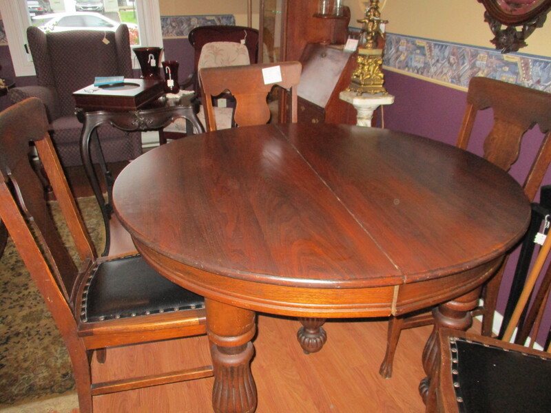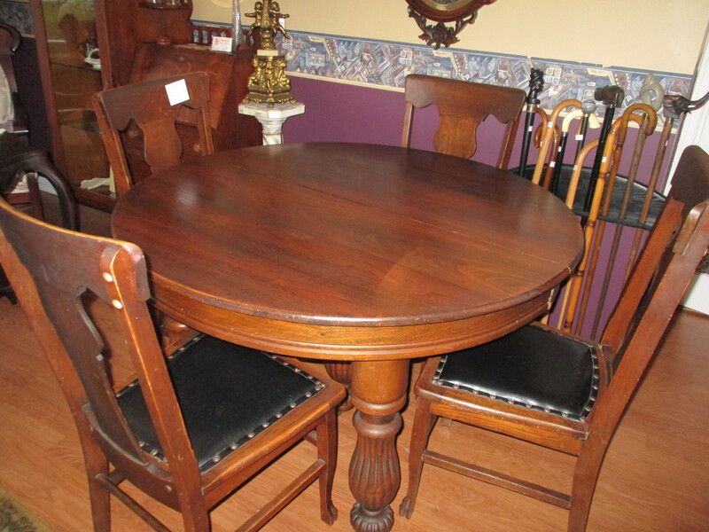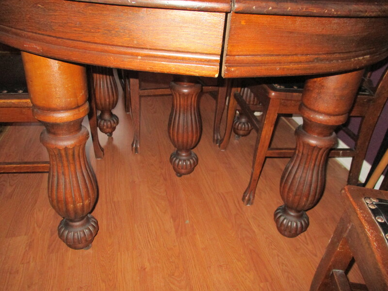 Ensemble de cuisine 5 morcaux, une table ronde et 4 chaises plus 6 rallonges totalisant 32 po. L'ensemble est en chêne, vers 1910. La table a 47 po de diamètre et 29 po 1/2 de hauteur. 5 belles pattes tournées et strillées.