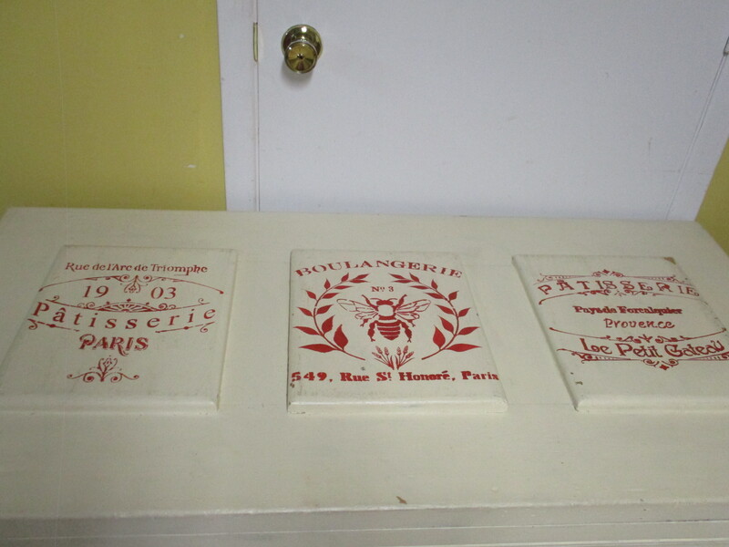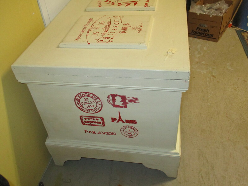 Grand coffre en pin de couleur crême décoré sur pochoir avec des adresses de Paris. 49 X 25 X 25 po de hauteur