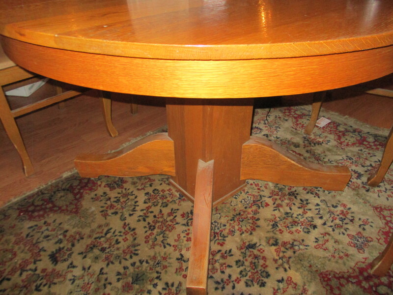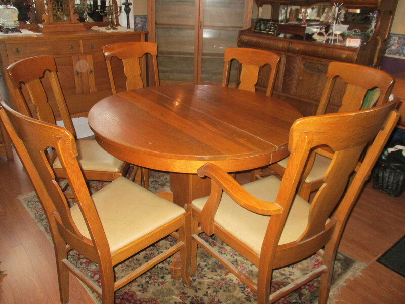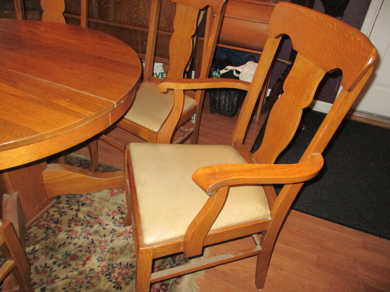 Set de cuisine en chêne et chêne m aillé de 7 m orceaux: table ronde, une chaise capitaine et 5 chaises droite. les sièges des chaises sont en vinyle. Table de 43 po de diamètre et 29 po de hauteur, 3 rallonges de 10 po chacune