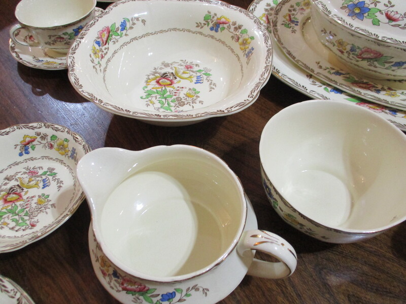 Très beau set de vaisselle 85 morceaux en porcelaine de marque Jérome Alfred Meakin, hand printed England. Vers 1930. 12 couverts: grande assiette, bol a soupe, assiette pour bol a soupe, assiette a pain, assiette a dessert, tasses et soucoupe et 10 pièces de service. Il manque quelques morceaux et quelques uns sont chippés.
