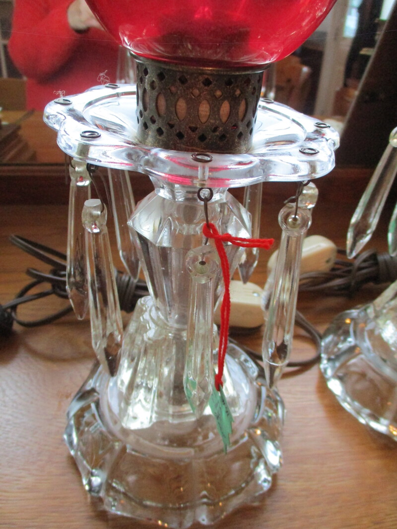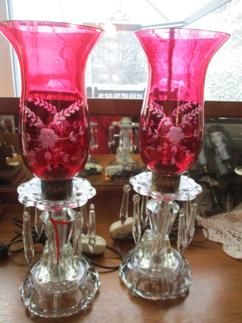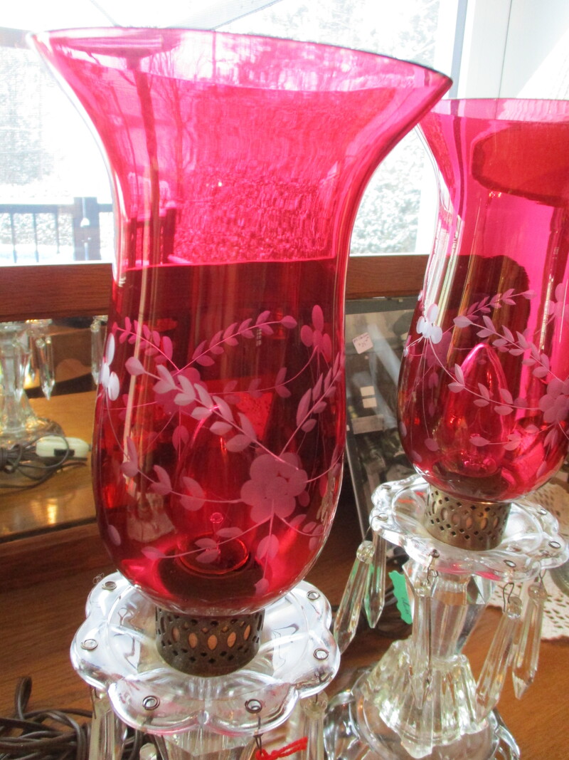 2 lampes en verre avec larmes en verre également. Le globe est de couleur Ruby Glass avec des feuilles et des fleurs argentées. 15 po de hauteur