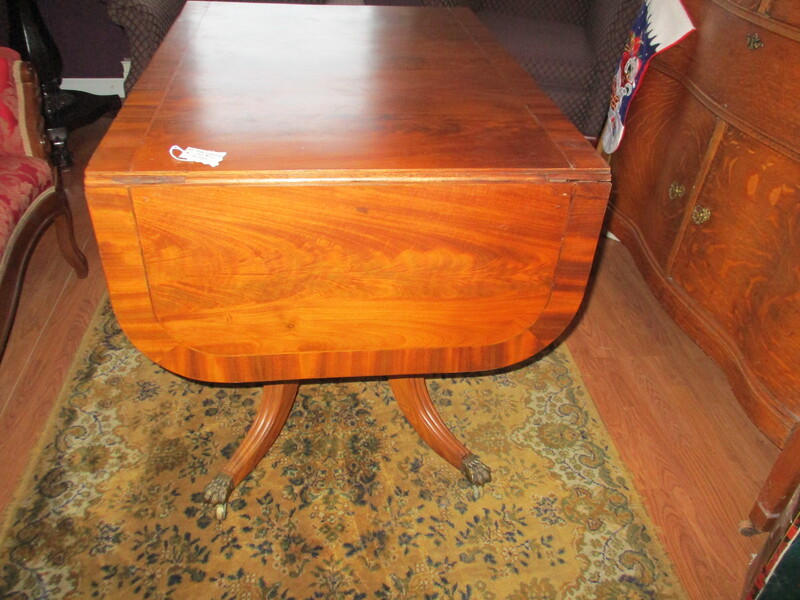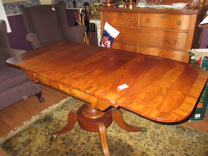 Magnifique table a panneaux en noyer avec un tiroir. Poteau central et 4 pattes galbées et pattes de lion. Sur roulette. Vers 1930. 35 X 24 1/2PO X 29 h. Avec 2 panneaux levées, la table fait 549 po , peut faire une table de travail ou une table de cuisine.