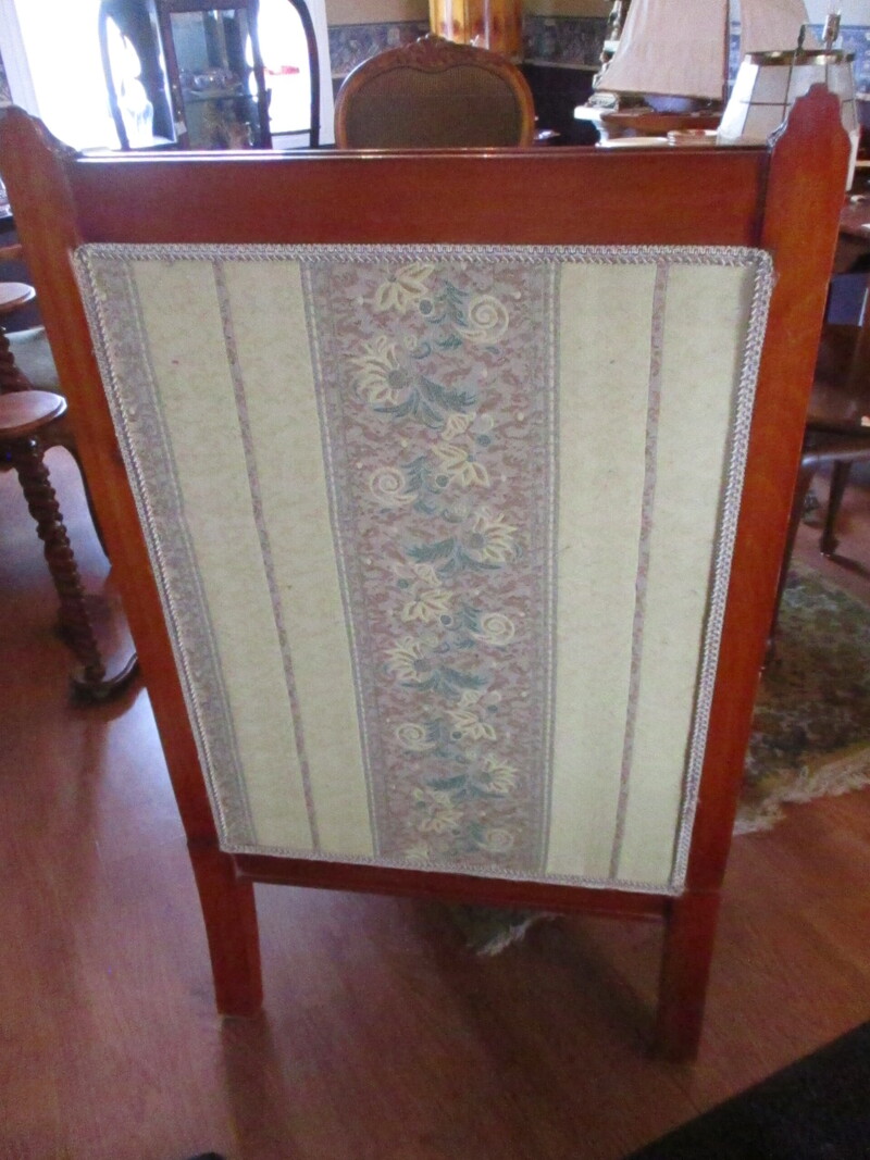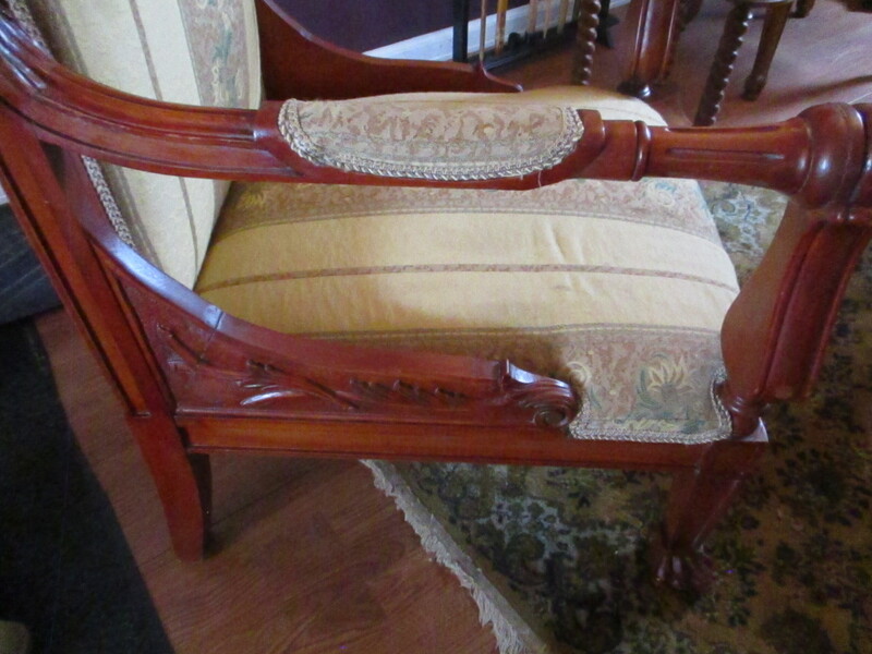 Fauteuil styleLouis XV EN ACAJOU. Sculptureau dossier, sur les côtés et èa l'avant. Pattes de lion a l'avant. Fin du X1Xe siècle