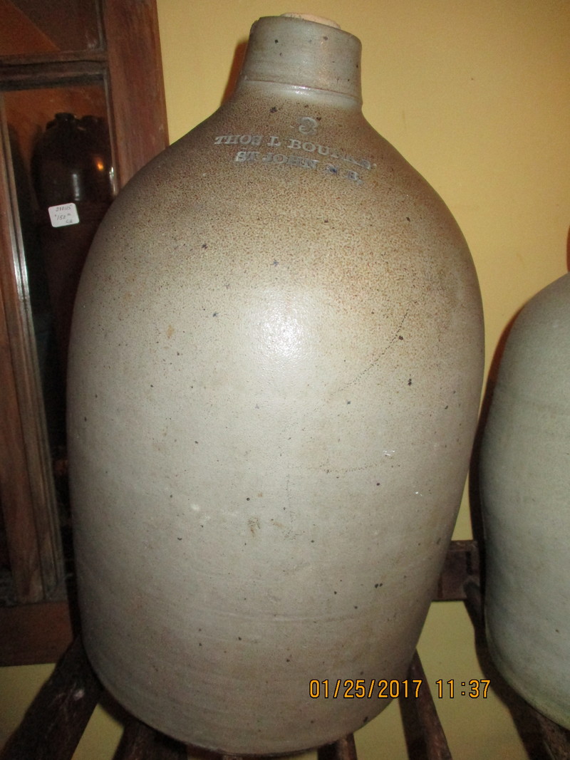 Cruche 3 gallons en excellent état. Signé "Thos L Bourke" St-John N.B. En grais de couleur grise. 16" de hauteur